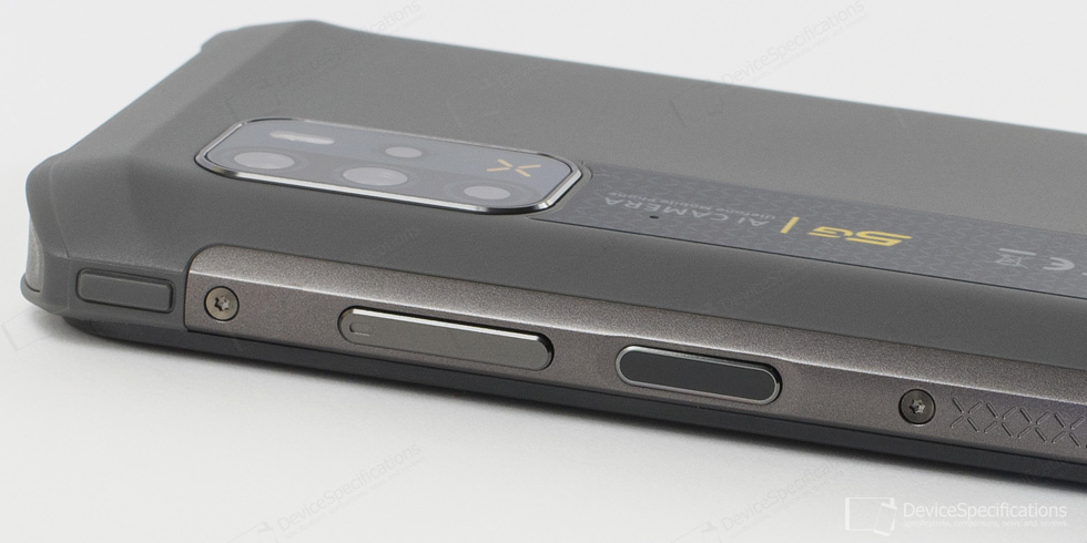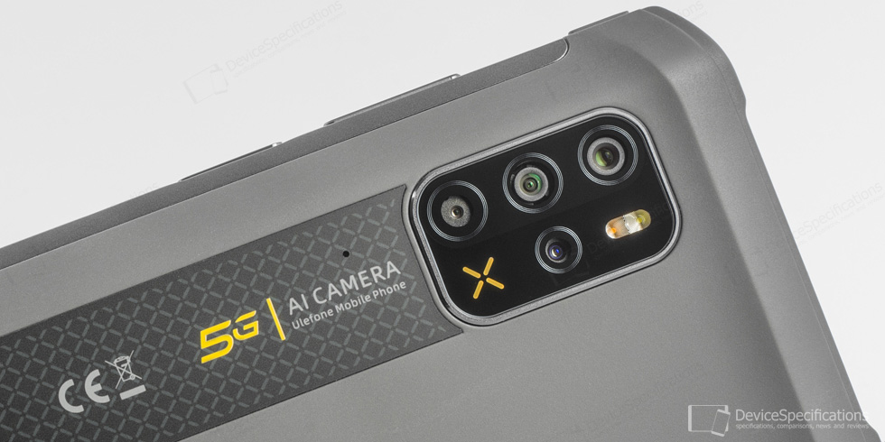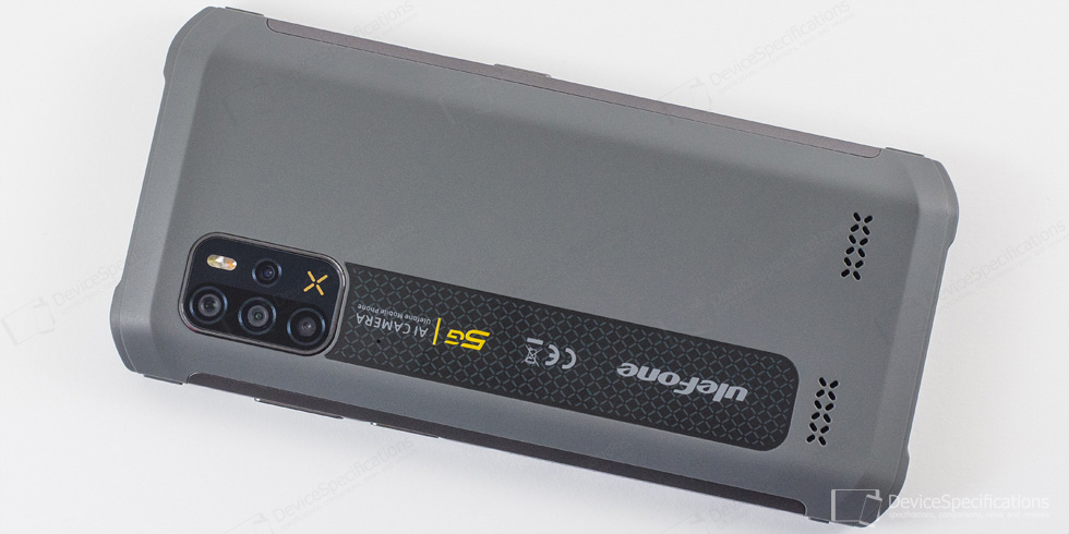 The rear shell is entirely covered with a rubbery coating that also covers the top and bottom frame, all four corners, and partially the side frames. The top-left corner houses the camera module with three of the cameras aligned vertically while the dual-tone LED flash and the fourth camera are aligned vertically to their right. Below this module, there's a black-colored strip with a microphone hole, pressure relief hole, the Ulefone logo, 5G and AI camera signs, CE mark. The bottom of the rear shell is occupied by the two linear stereo speakers. The speaker grill holes have an X-like shape. The same X shape icon is imprinted in the camera module as a decoration in orange color.
