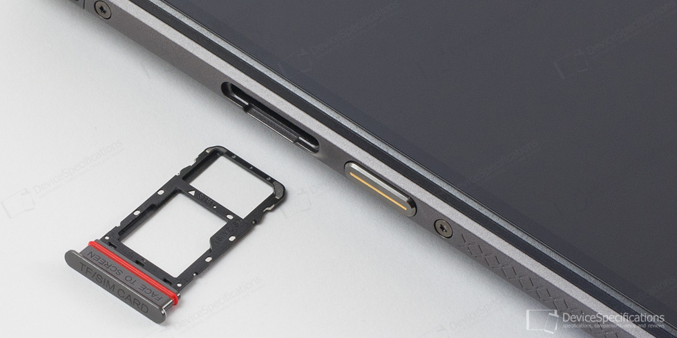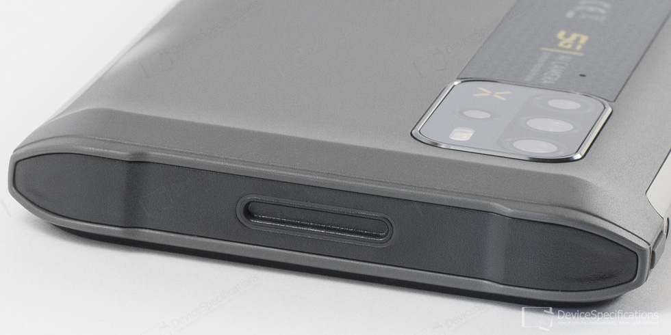 The top frame has an indented area without a specified purpose. The bottom one houses the USB Type-C port and a microphone hole. The right bottom corner has a special area for attaching the hand strap. The left frame is the home to the hybrid, dual-SIM tray and the customizable button. The right frame is where you'll find the Volume Up/Down button and the Power one. The Power button has an embedded capacitive fingerprint sensor. The side frames are made of metal and have an X-shaped decoration that has not only aesthetic purpose but also makes handling more comfortable as the device is less slippery.
