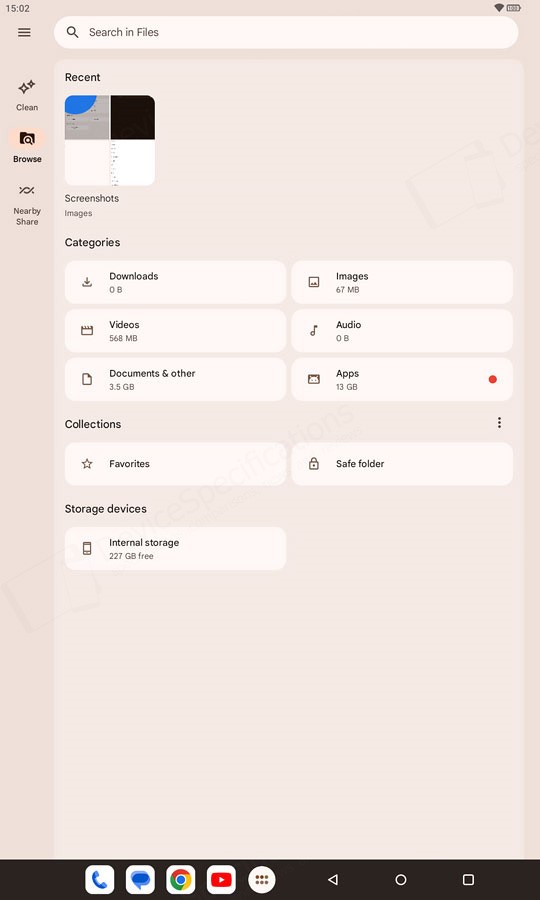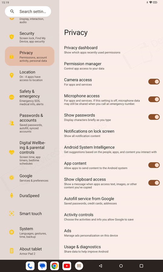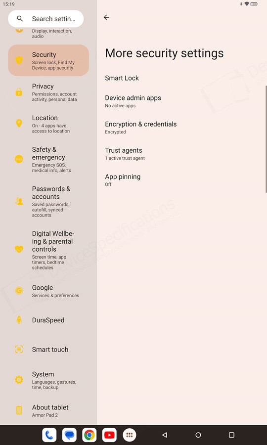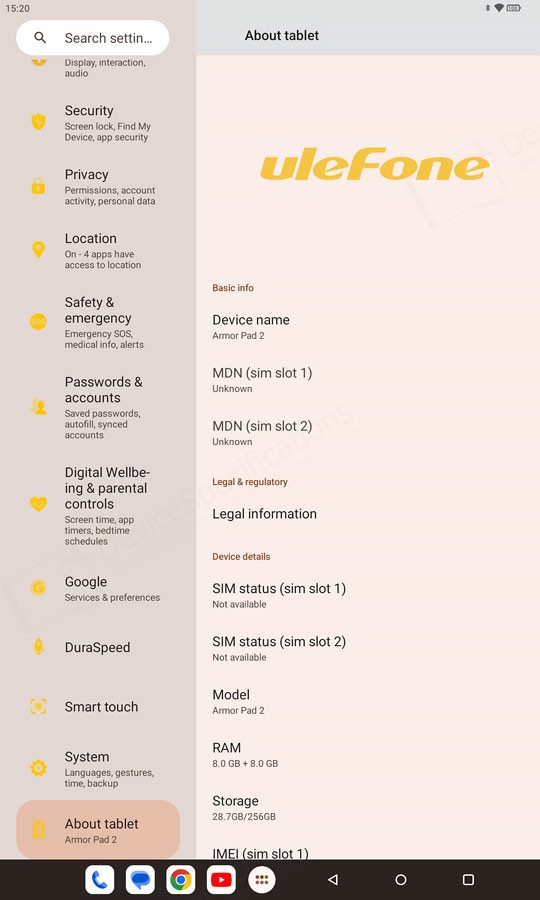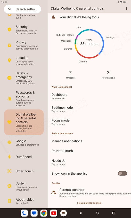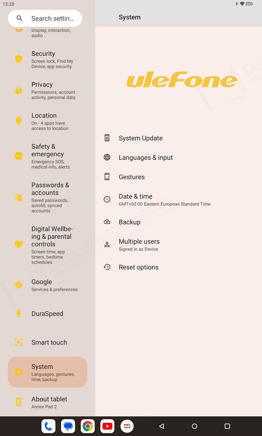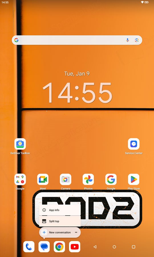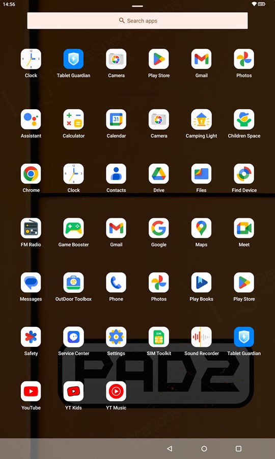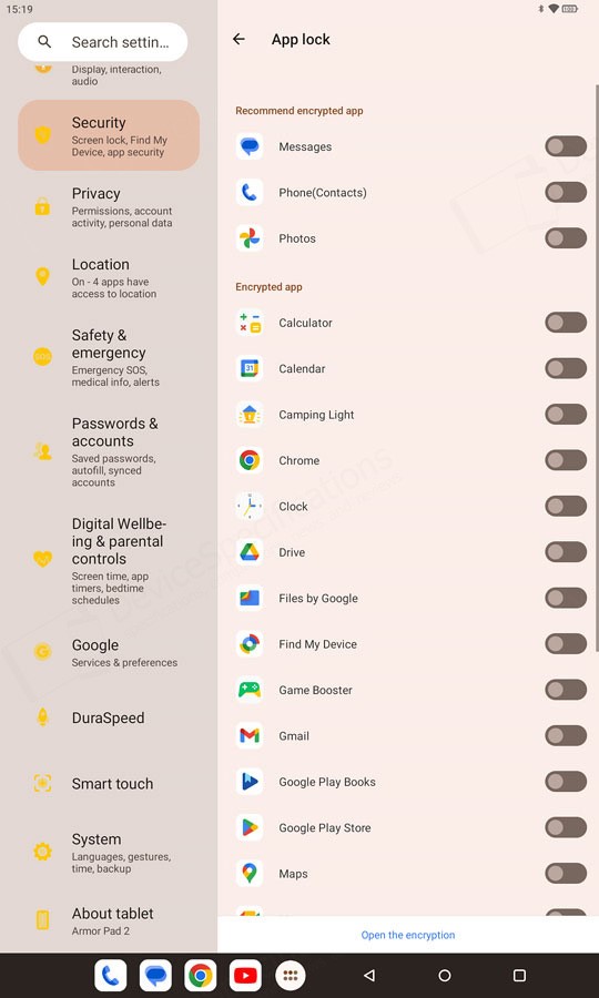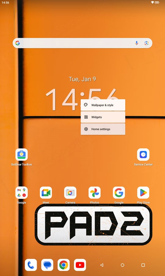 Ulefone Armor Pad 2 runs on stock Android 13 and some UI elements reflect the fact that this is a big-screen tablet and a re-designed accordingly. The Lock Screen is quite minimalistic. A big Clock widget appears in the middle of the screen with a small Date one, and some icons in the status bar area. As usual, the default screen unlock is by a swipe and this can be changed from the Security settings. The Home screen has a Google search bar on top with Lens and Voice search embedded. A Dite and Time widget is placed in the upper half of the screen, followed b y a row of favorite apps. At the very bottom of the screen, you see the docked row of apps and the virtual navigation bar. If you choose onscreen gesture navigation, these virtual buttons simply disappear. Desktop shortcuts are supported and Google Discover is on by default. There's no option to switch it off. There's an app drawer listing all applications on one page in alphabetic order with an app search bar and a row of the most recently used applications on top.