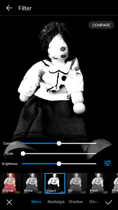 Expectedly, the Camera software on Huawei P10 is far from being a stock Android one. It is designed to serve all three cameras available on the device and includes lots of features. Besides the usual LED flash options, on the top of the screen, there are several other toggles. The first is for the Wide Aperture mode for close-up shots (no more than 2 meters). You can adjust the focal point after taking a photo to blur the background and make the subject stand out. It is available only in the Photo, Monochrome and Video mode. The second is for the "Leica-style" portrait mode that uses 3D face detection along with beautification effects (skin smoothing), adjustable illumination and fake bokeh. The third mode allows you to adjust the colouring style - standard, vivid, or smooth. The fourth contains a number of filters. The last icon on the top of the screen is the camera switch. At the bottom of the screen are located the shortcut to the list of photos, a circular shutter button, and a video button.