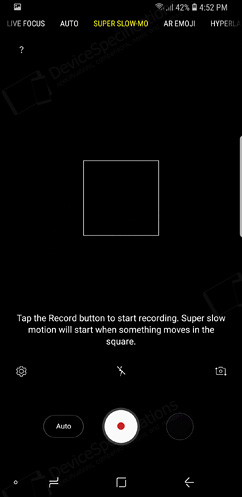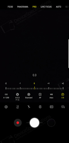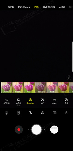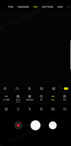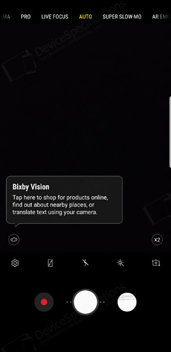 The Camera application is completely re-designed in order to serve the new camera capabilities better. The shutter button is placed in the centre of the button with the video recording button to its left and the shortcut to the list of photos to its right. Above them, there's a list of various shortcuts for quick settings such as the shortcut to the camera settings, full screen and flash options, a choice of filters and camera switch. Above this list, you will see the Bixby Vision button in the left and the icon designating the level of optical zoom (up to 2x), avaialble only on the S9+. At the top of the screen, the various shooting modes are listed and include the default Auto one, Super Slow-Mo, AR Emoji, Hyperlapse, PRO mode for adjusting the aperture (available only for the first camera), ISO, white balance, focus, exposure, shutter speed, filter, Panorama mode, and Food mode. When you touch the video recording button, the recording starts immediately. There is no Selective focus available on the Galaxy S9 but there is a Live Focus mode, which allows you to create a quality background blur and apply beautification effects if you're shooting portraits with it by adjusting the depth of field.