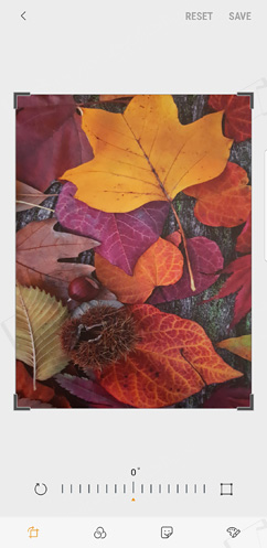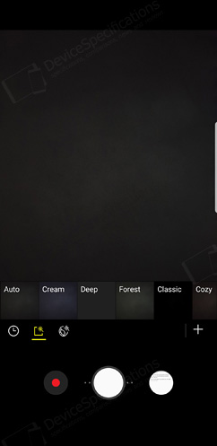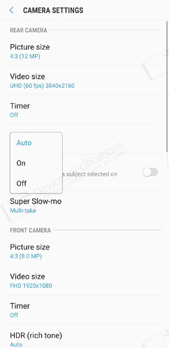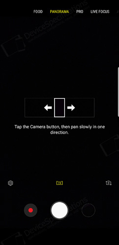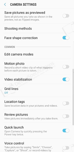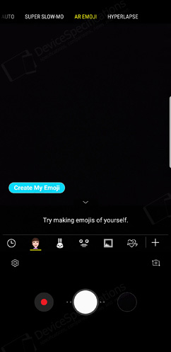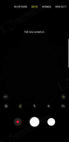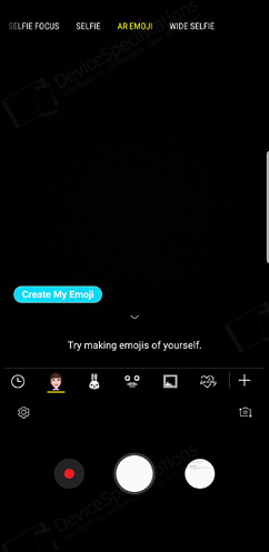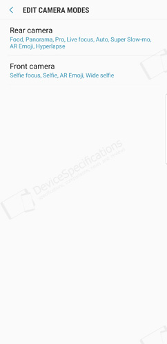 The front-facing camera is equipped with an 8-megapixel Samsung S5K3H1 1/3.6" image sensor from System LSI with a 1.22μm pixel size. It is coupled with an 80° wide-angle lens with f/1.7 aperture. The same hardware setup is used for the front-facing camera of the Galaxy S8/S8+ and the Galaxy S9. The selfie camera takes photos with a resolution of 3264 x 2448 pixels and shoots 2K videos at 30 fps. It supports Auto HDR, AR Emoji, Wide selfies and improved bokeh effect on portraits.Camera App