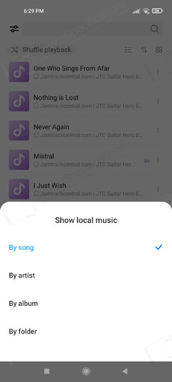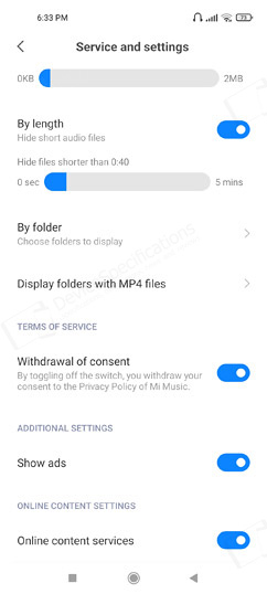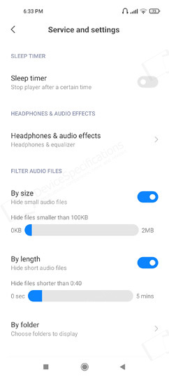 Xiaomi's Music app for the global MIUI versions is seriously simplified and many of its features typical for the Chinese MIUI version are cut off. For the global version, you get three tabs - recent, favorites, and playlists, placed above the list with audio files and with various options for sorting the files. The Now Playing screen is fully free from clutter. There are additional app settings from where you can access the headphones and audio effects - the same ones that can be accessed from the Sound menu in the System Settings. The Sound Effects contain options for preset sound effects, adjusting the sound to your earphones, equalizer, volume adjustment according to your age, headphone remote buttons, and their assignment.
