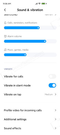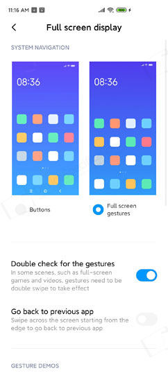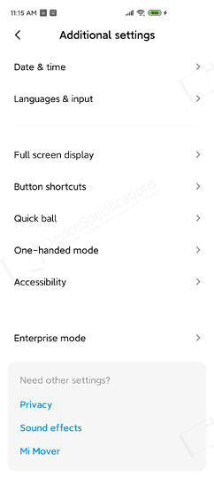 The third group of menus includes settings for the Lock Screen, Display, Sound & Vibration, Notifications, Home Screen, Wallpapers, Themes. The Lock Screen menu includes toggles for Raise-to-Wake, Double-tap-to-wake features, Wallpaper Carousel settings, clock format, etc. The Display menu manages the brightness level, reading mode, refresh rate - 60Hz or 120Hz, Dark Mode, System font style/size/weight, options for various designs of the notch and the status bar. The Dark Mode and the Notch options were introduced on later MIUI 10 versions. Of course, there's the Color Scheme menu from where you can set up the display profile depending on the type of content you're viewing. You can choose from up to 9 combinations between three color temperature styles (default, warm, cool) and three color styles (auto, saturated, standard).