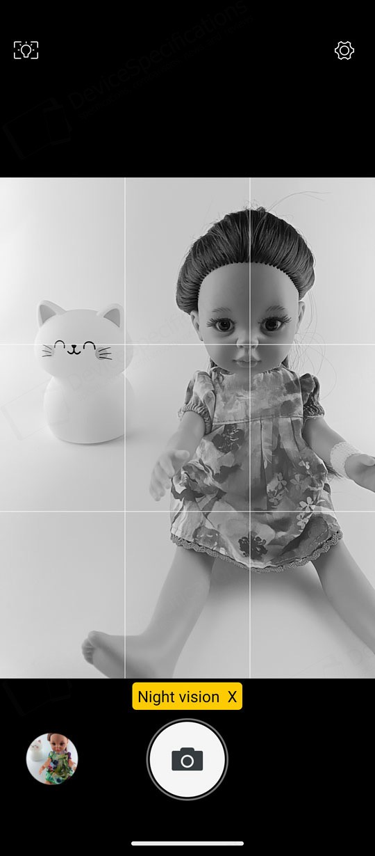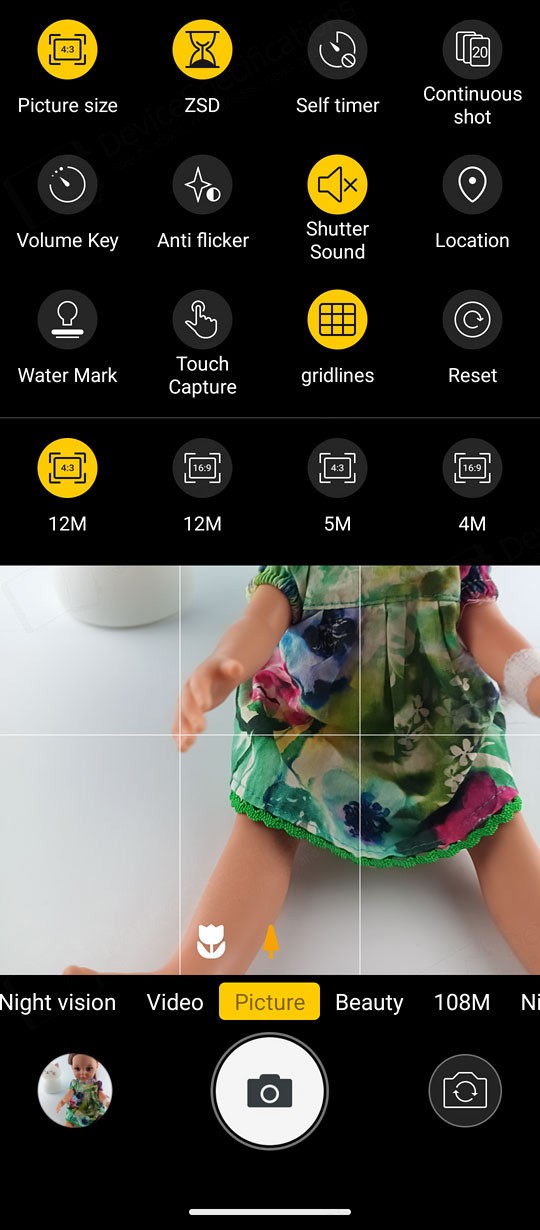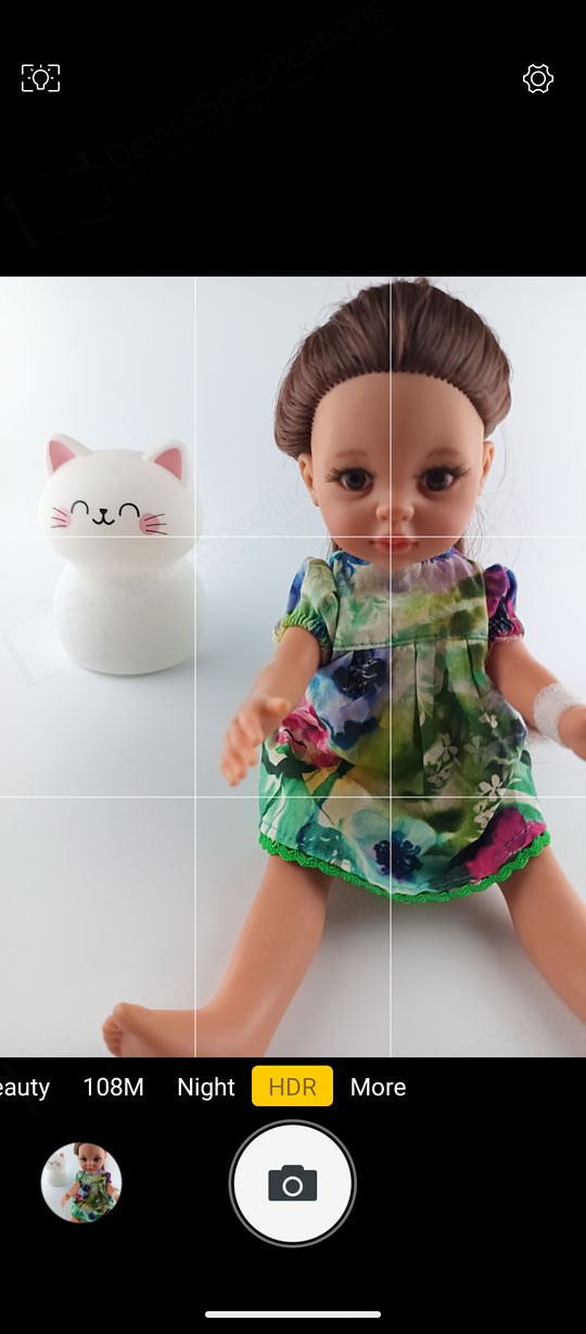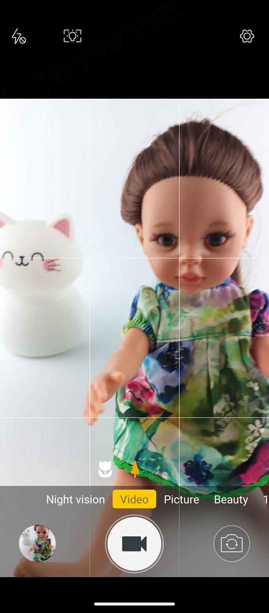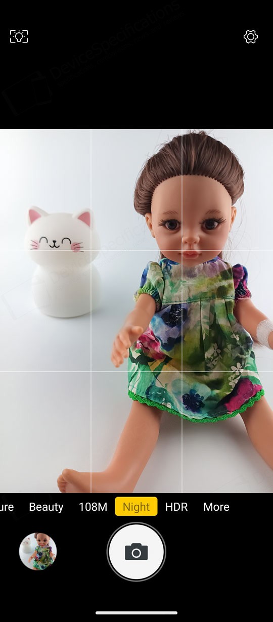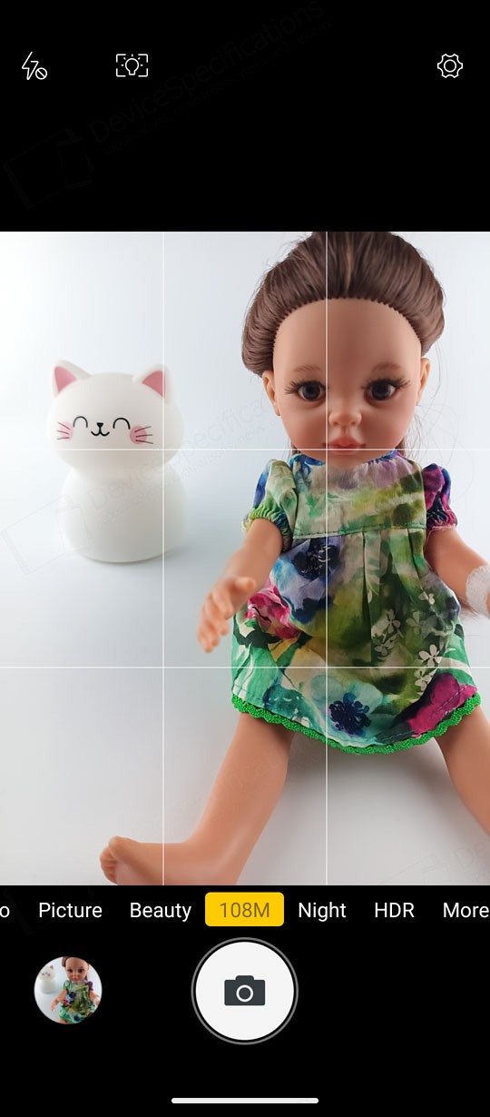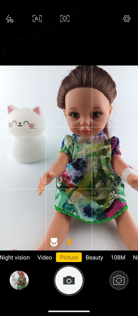 The Camera app is designed with a simple, intuitive layout. The large circular shutter button sits centered at the bottom of the screen, with the camera switch on its right and a shortcut to your photo and video gallery on its left. Just above them is a carousel of shooting modes. The default "Picture" mode supports AI scene detection, HDR, LED flash, and digital zoom. A settings cog in the top‑right corner opens additional options such as grid lines, picture size, and the self‑timer.Two icons above the mode carousel let you toggle between the main and macro cameras. The "Video" mode includes flash controls and extra video settings accessible through the cog icon. "Night Vision" uses its dedicated camera and replaces the camera switch with a video‑recording button. To capture photos at the sensor's full resolution, you can select the "108" mode. "Beauty" allows portrait shooting with adjustable background blur and beautification effects, while background blur can also be fine‑tuned in "Portrait" mode. The "Night" mode uses the main camera and so is the "HDR" mode. The "More" tab includes the "Pro", "Portrait", "Gif", "Panorama", and "Mono" modes.