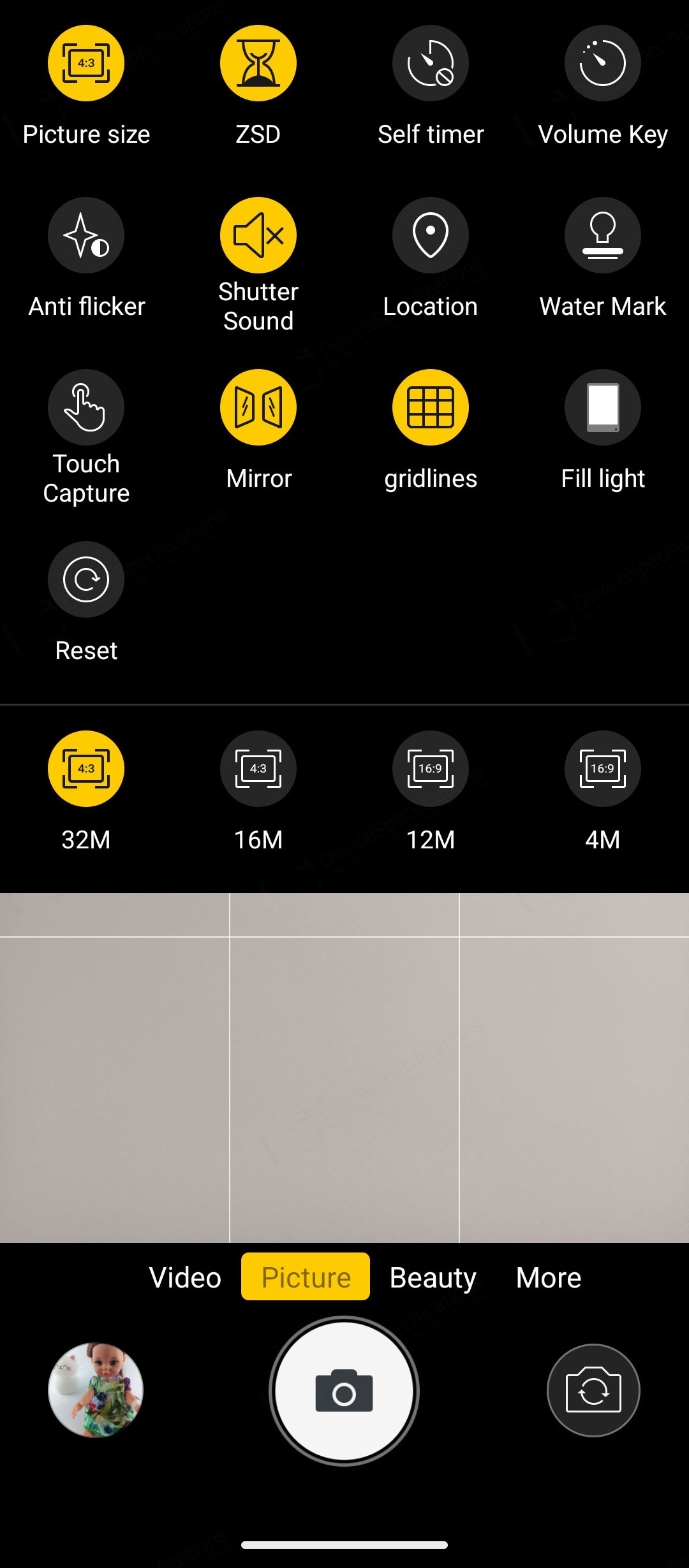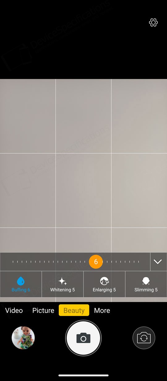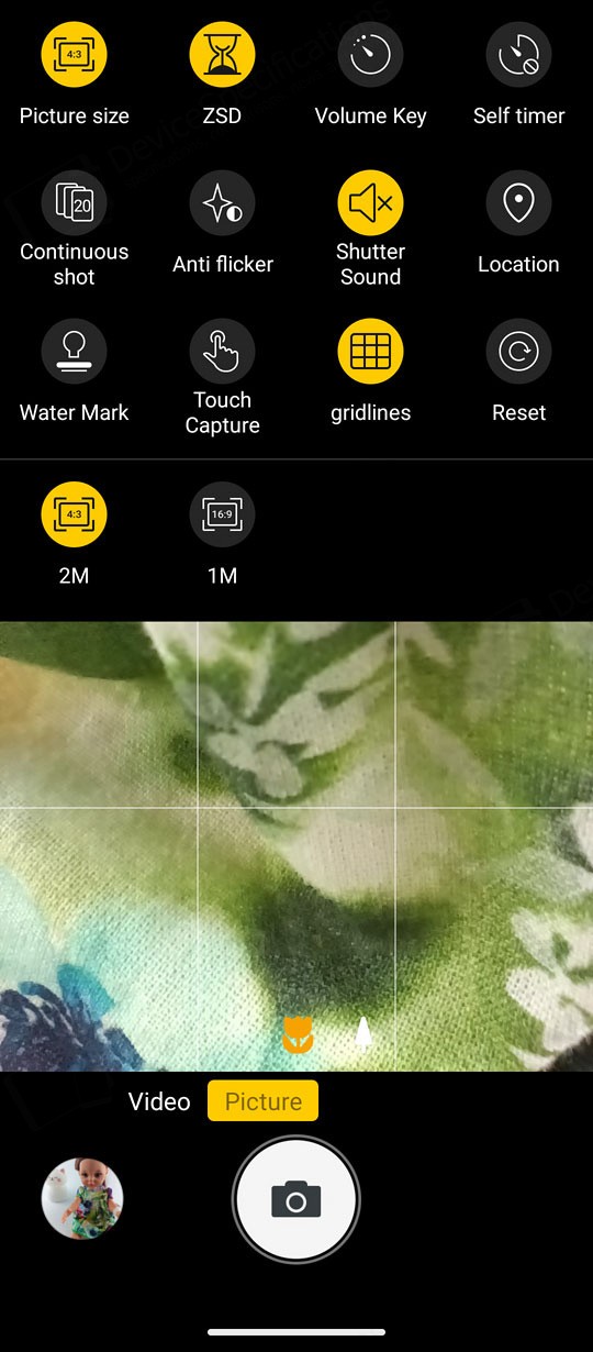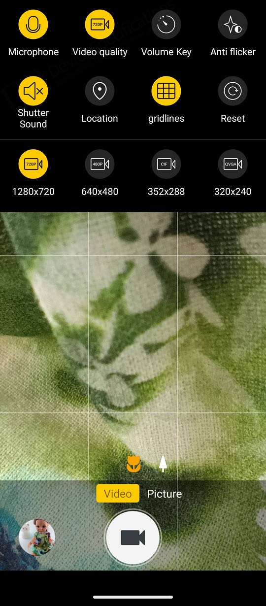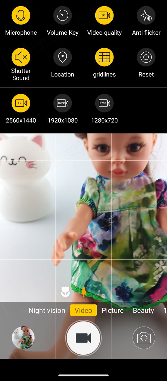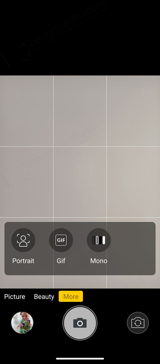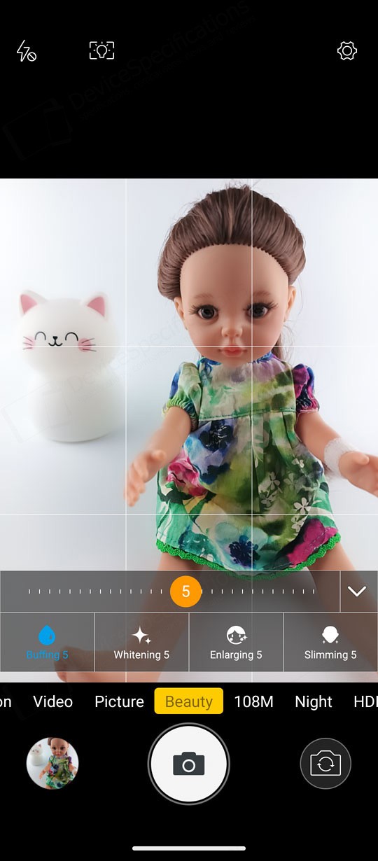 The Camera app is designed with a simple, intuitive layout. The large circular shutter button sits centered at the bottom of the screen, with the camera switch on its right and a shortcut to your photo and video gallery on its left. Just above them is a carousel of shooting modes. The default "Picture" mode supports AI scene detection, HDR, LED flash, and digital zoom. A settings cog in the top‑right corner opens additional options such as grid lines, picture size, and the self‑timer.Two icons above the mode carousel let you toggle between the main and macro cameras. The "Video" mode includes flash controls and extra video settings accessible through the cog icon. "Night Vision" uses its dedicated camera and replaces the camera switch with a video‑recording button. To capture photos at the sensor's full resolution, you can select the "108" mode. "Beauty" allows portrait shooting with adjustable background blur and beautification effects, while background blur can also be fine‑tuned in "Portrait" mode. The "Night" mode uses the main camera and so is the "HDR" mode. The "More" tab includes the "Pro", "Portrait", "Gif", "Panorama", and "Mono" modes.