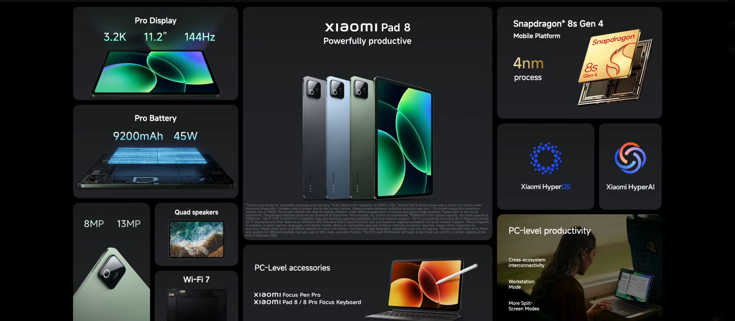 The Xiaomi Pad 8 is powered by the Snapdragon 8s Gen 4 chipset and comes with either 8GB LPDDR5X or 12GB LPDDR5T RAM, paired with 128GB UFS 3.1 or 256GB UFS 4.1 storage. Its camera setup includes a 13MP main sensor capable of 4K video and an 8MP OmniVision OV08D front camera.