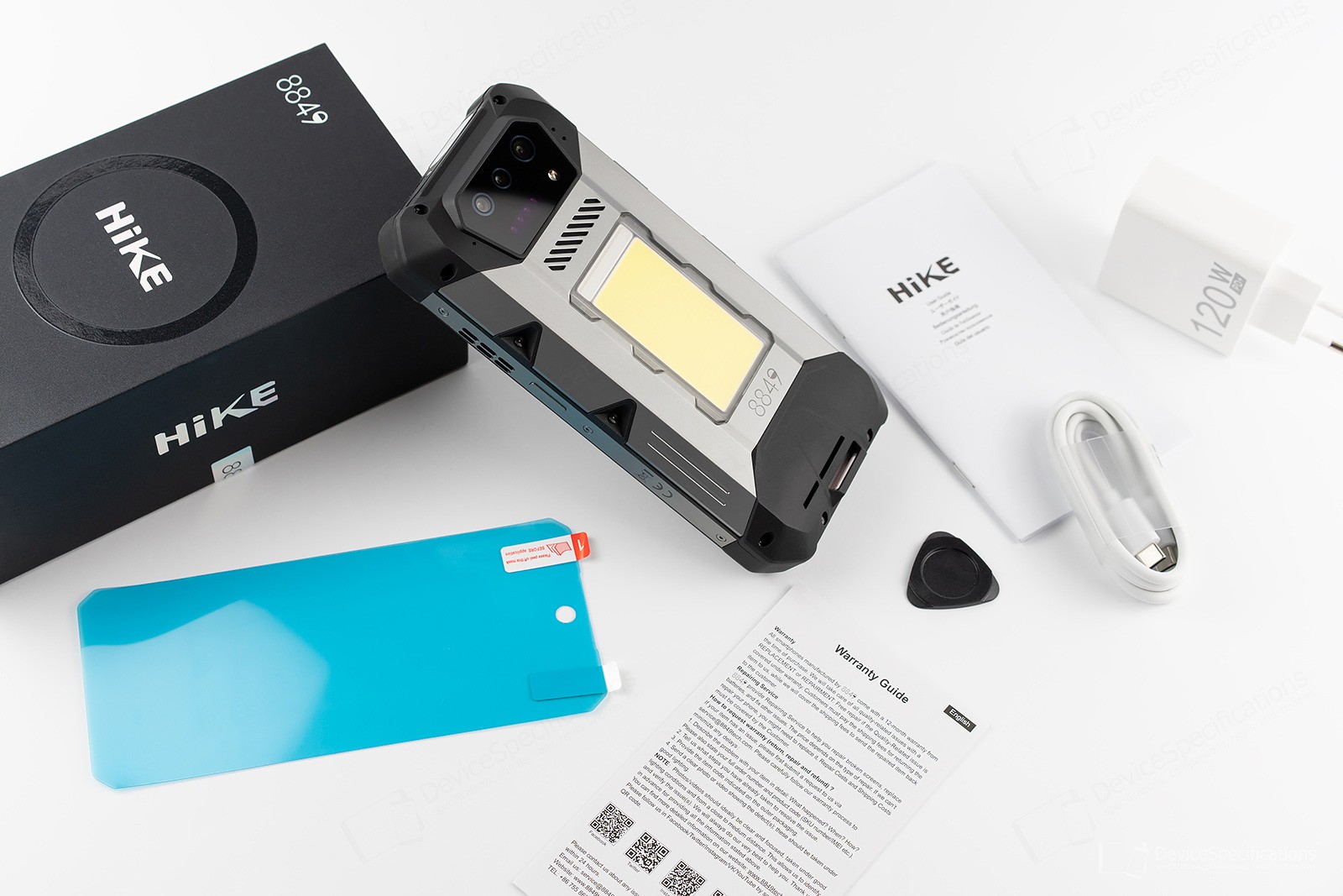 Unihertz 8849 HiKE features a 6.79-inch in-cell IPS display with an FHD+ resolution of 1080 x 2460 px and a 120 Hz refresh rate. The device also boasts dual stereo speakers mounted on the rear shell for clear and powerful audio. Furthermore, it arrives with a 1200-Lumen dual-lamp torch that can light up an area up to 200 meters. There's also a bright camping light paired with red and blue warning lights.The camera department is quite versatile and comprises a 32MP Samsung S5KGD1 selfie snapper, a 50MP Sony IMX766 main camera with an f/1.88 aperture, a 64MP OV64B40 Night Vision unit with four IR lights, and an 8MP SK Hynix Hi-847 telephoto lens with an f/2.4 aperture. Power is supplied by a 23800 mAh battery with 120W fast charging and 10W reverse wired charging support. A MediaTek Helio G200 chipset ticks under the hood. It combines a 2.2GHz octa-core CPU with a 1.1GHz dual-core Mali-G57 GPU, 12GB of LPDDR4X RAM, and 512GB of UFS 2.2 storage.